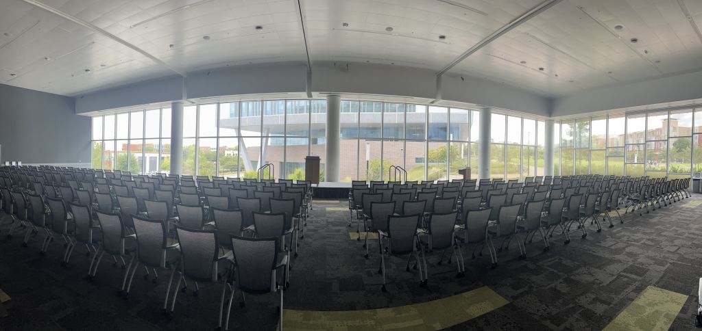 James B. Hunt Library was featured in Time magazine as the Library of the Future when first opened in 2013, winning numerous architectural awards for its design. The Duke Energy Hall is a versatile, 5,400-square-foot event space located on the second floor of this library that can be divided into four smaller rooms to suit different needs. It is designed to host a variety of functions, including conferences, banquets, and career fairs, with a maximum capacity of 284 people in an auditorium setup.